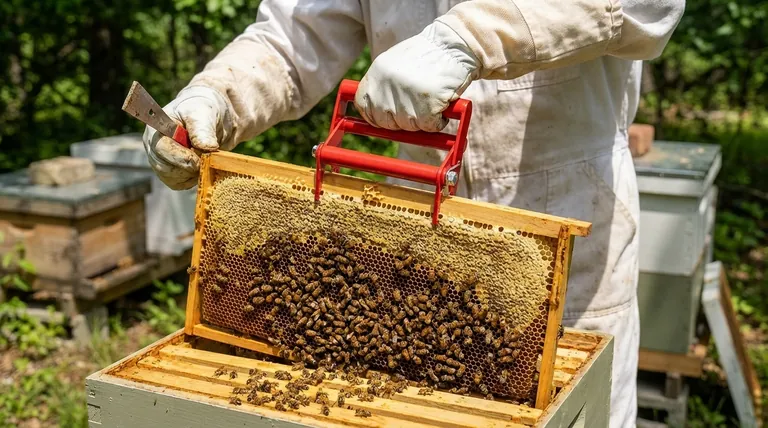 Всегда используйте свой инструмент для улья — инструмент, предназначенный для рычага, — чтобы осторожно отделить рамку. Попытка вырвать ее с помощью захвата только повредит ваше оборудование и разозлит пчел.